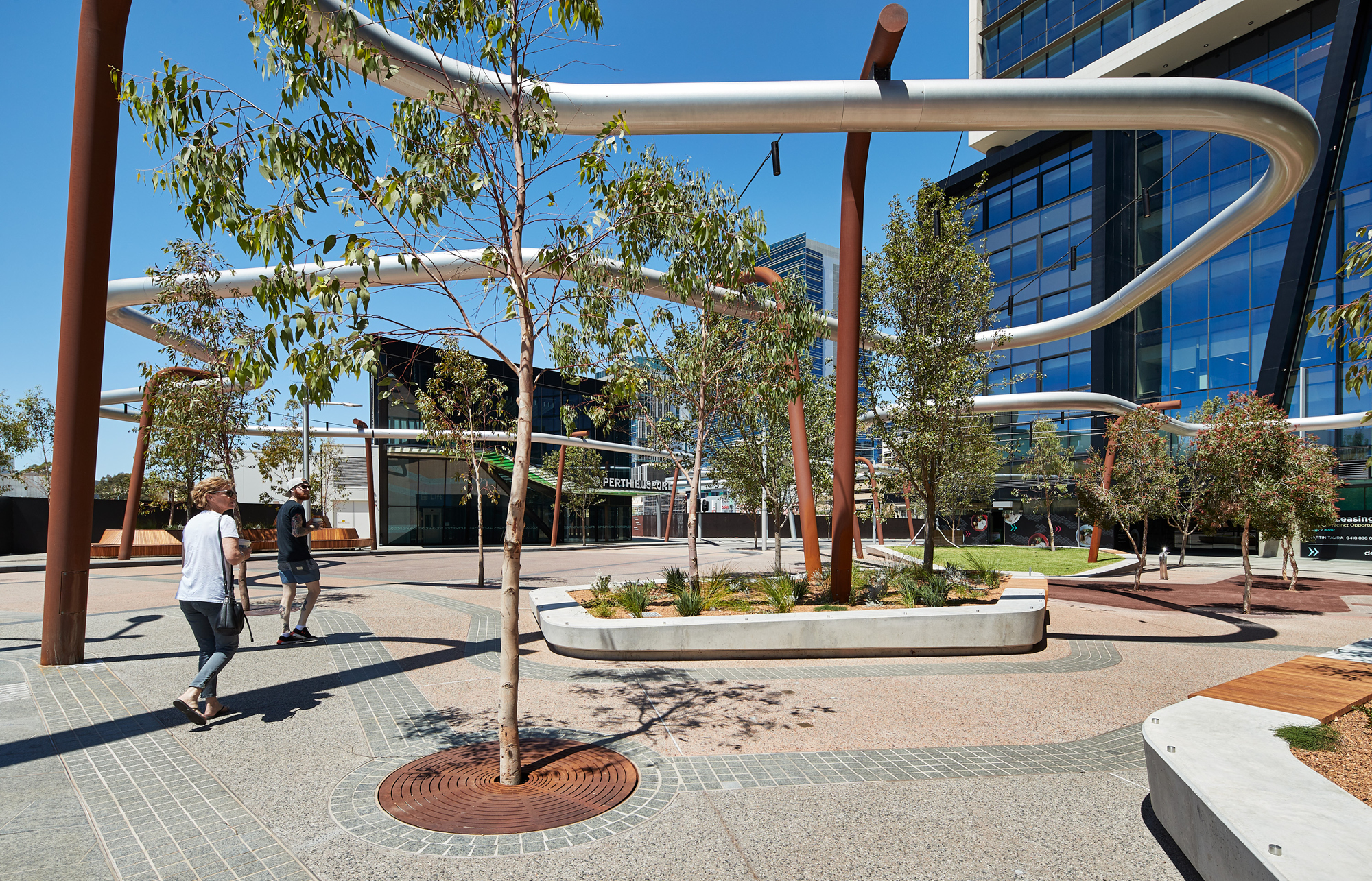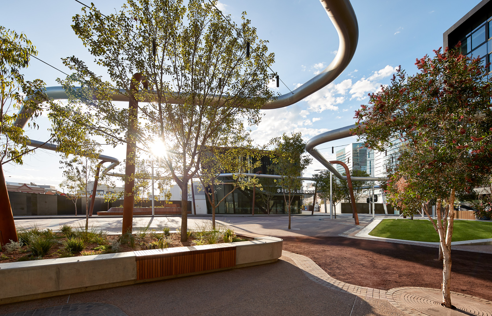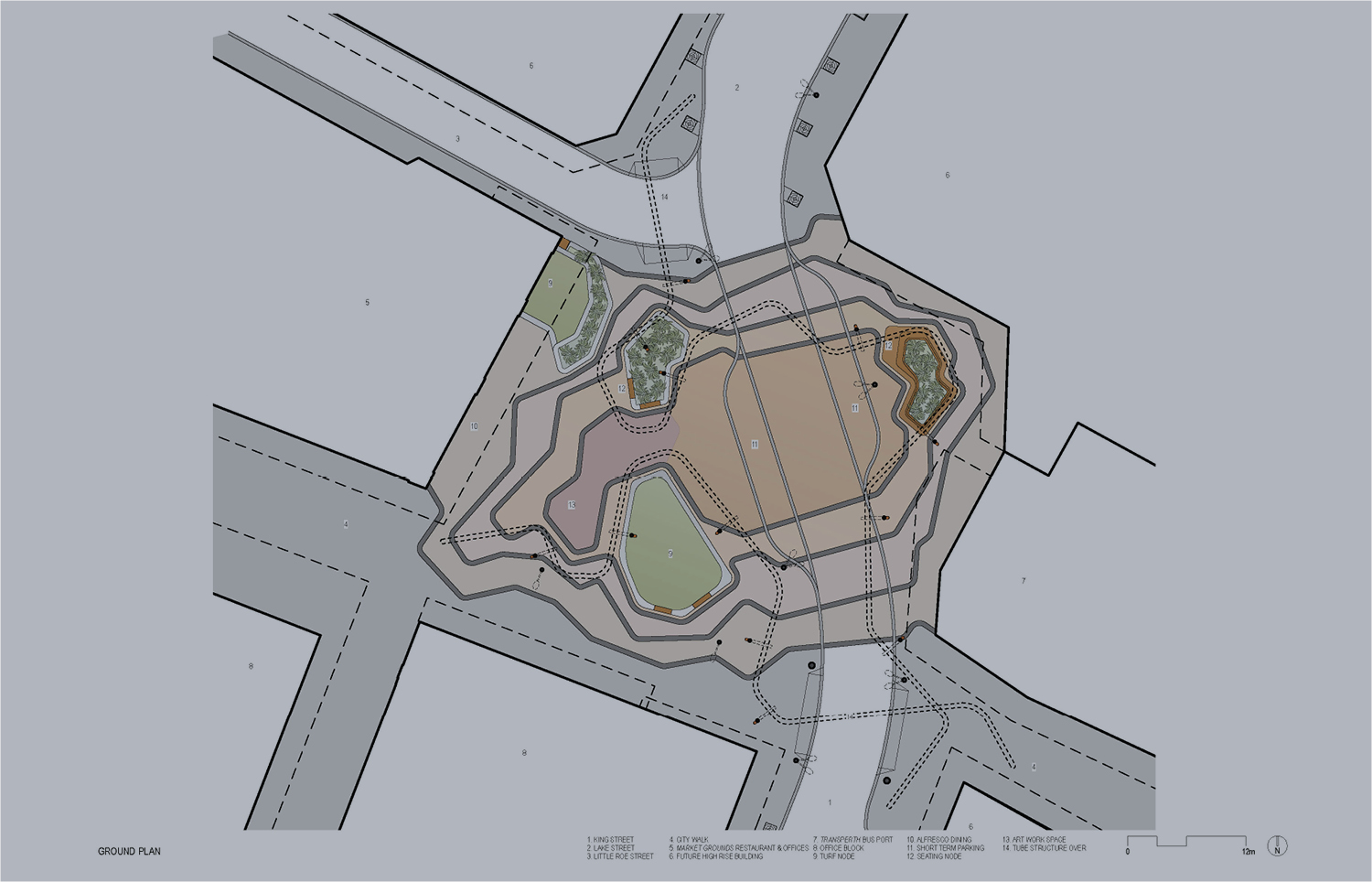 Manatj Park (Black Cockatoo Park) is a crossing of culture and place, from the Swan River in the south to remnant lakes in the north at Hyde Park and Yagan Square in the east to the Perth Arena in the west. The legendary place of the former meeting of two Kings, the first occupants and traditional owners and the first settlers. A place of meeting without meeting, a place to discuss without discussing, a place of friction without fighting. A temporary place to visit and rest, to look up, across and down. The presence of the former lakes is evident in the coloured concrete, a mix of browns, a surface disappearing in time. An elevated tube reappears from Yagan Square, emerging out of the ground, in dialogue with the ground formations, holding spaces together without touching, a conversation without conversing.