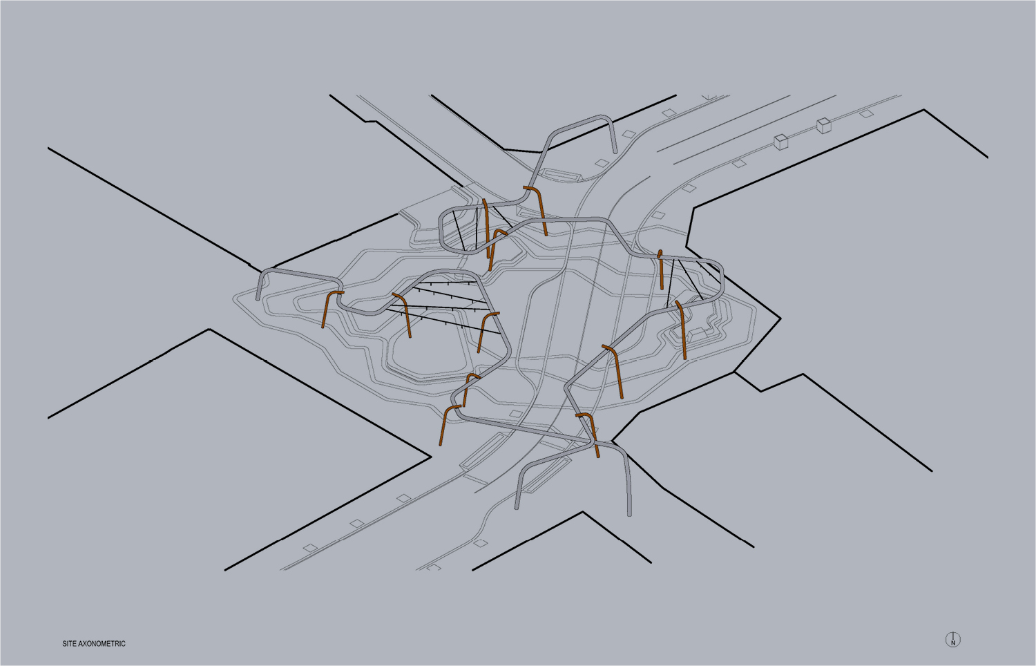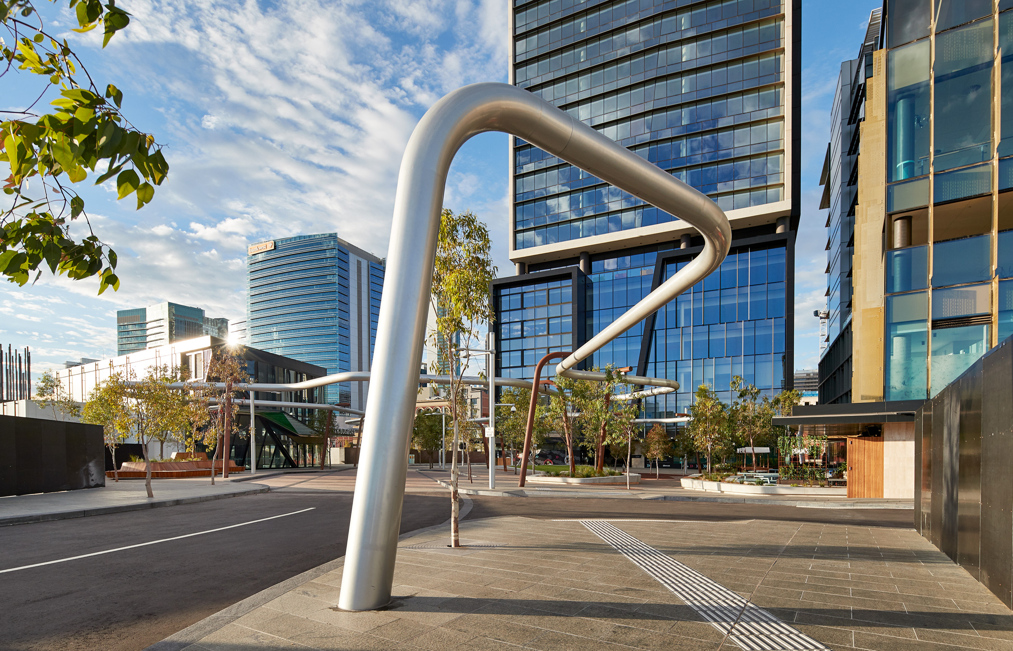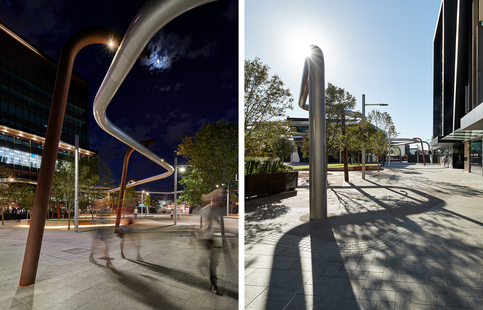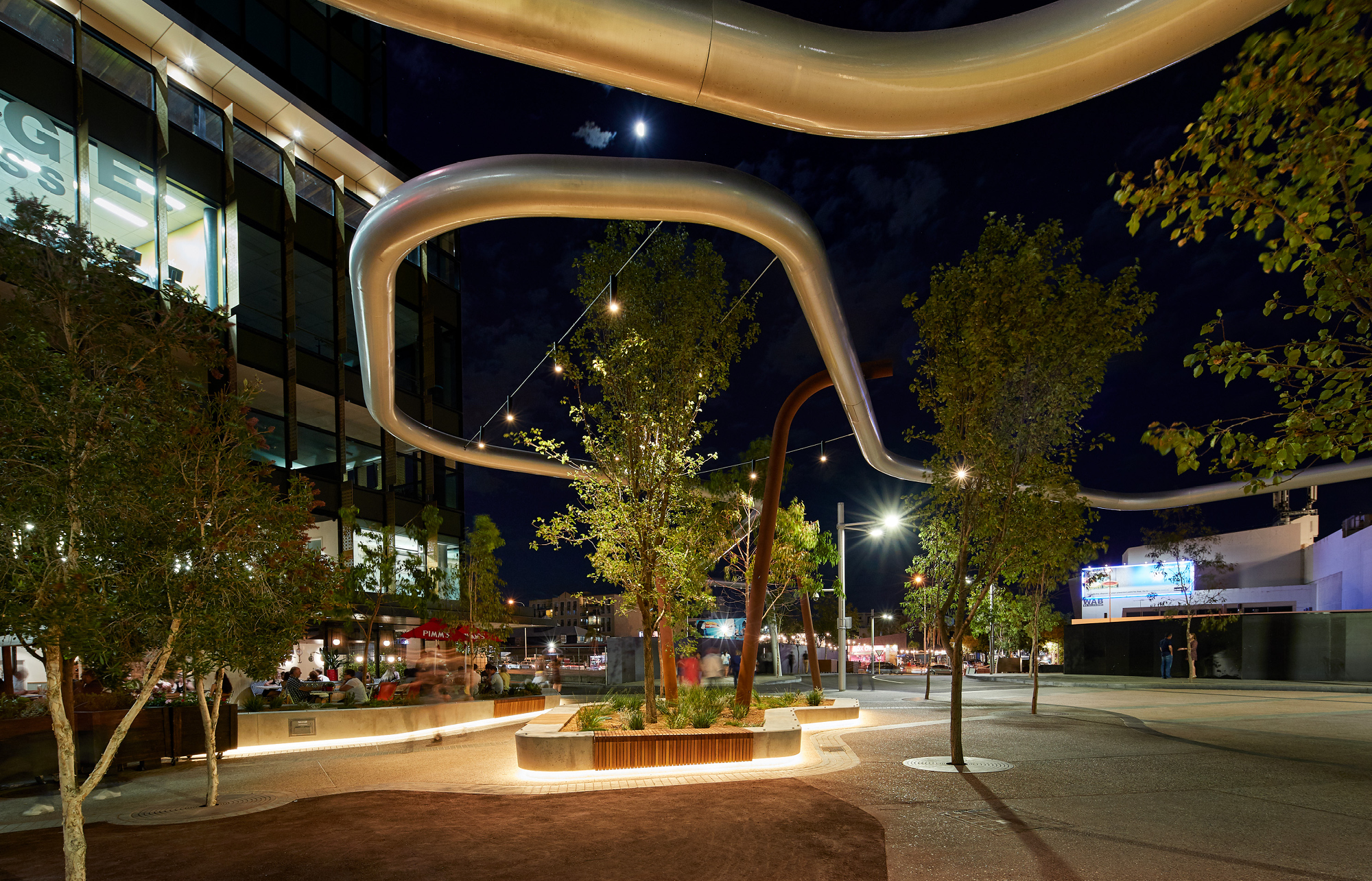 Manatj Park (Black Cockatoo Park) is a crossing of culture and place, from the Swan River in the south to remnant lakes in the north at Hyde Park and Yagan Square in the east to the Perth Arena in the west. The legendary place of the former meeting of two Kings, the first occupants and traditional owners and the first settlers. A place of meeting without meeting, a place to discuss without discussing, a place of friction without fighting. A temporary place to visit and rest, to look up, across and down. The presence of the former lakes is evident in the coloured concrete, a mix of browns, a surface disappearing in time. An elevated tube reappears from Yagan Square, emerging out of the ground, in dialogue with the ground formations, holding spaces together without touching, a conversation without conversing.