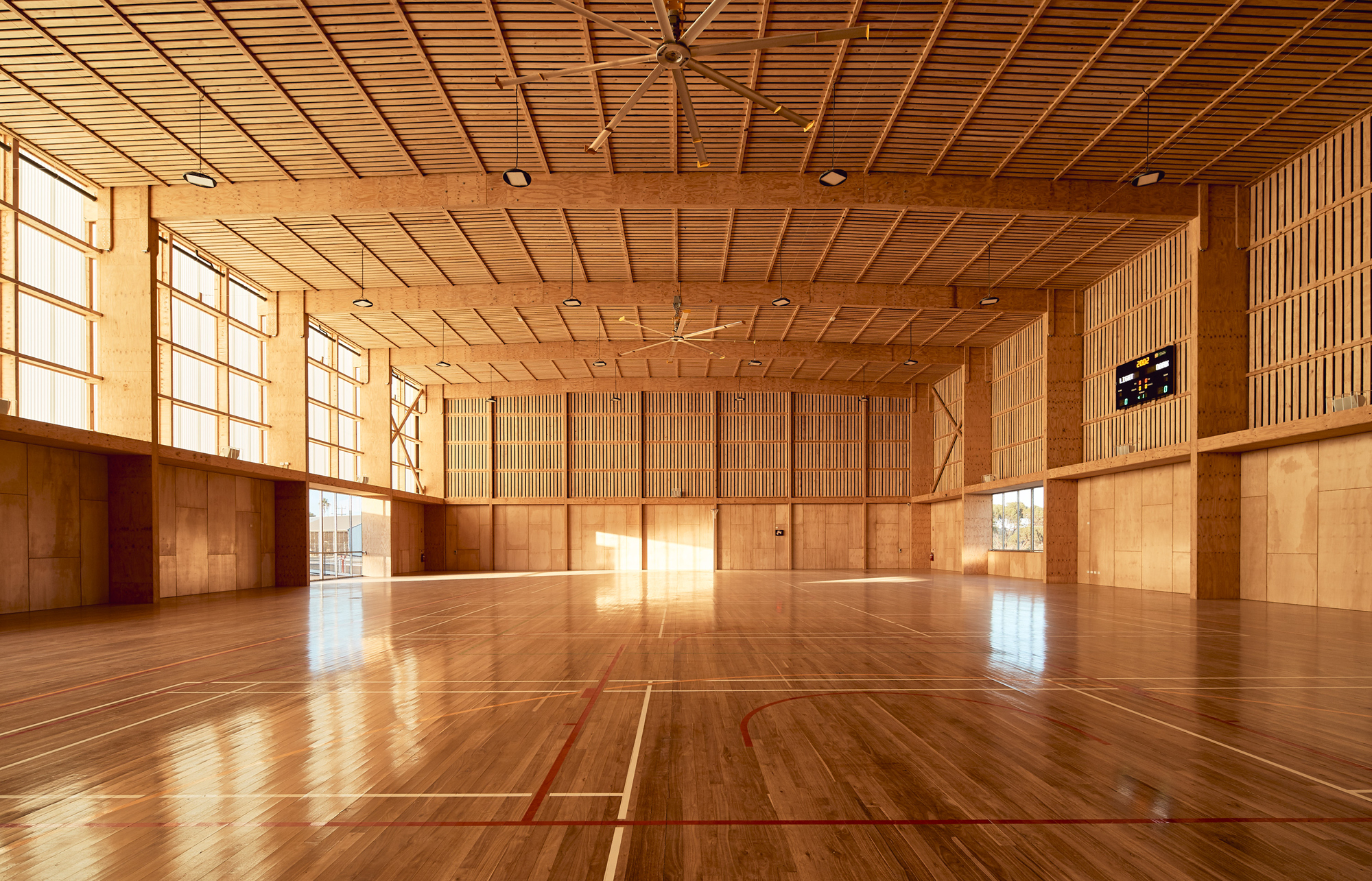 The Multi-Function Sports Hall is a portal frame structure spanning 28.5 meters using a Pinus radiata LVL box system. The floor and deck structure throughout the complex comprises LVL bearers and joists using a dovetailed mortice and tenon assembly requiring no mechanical fixings.