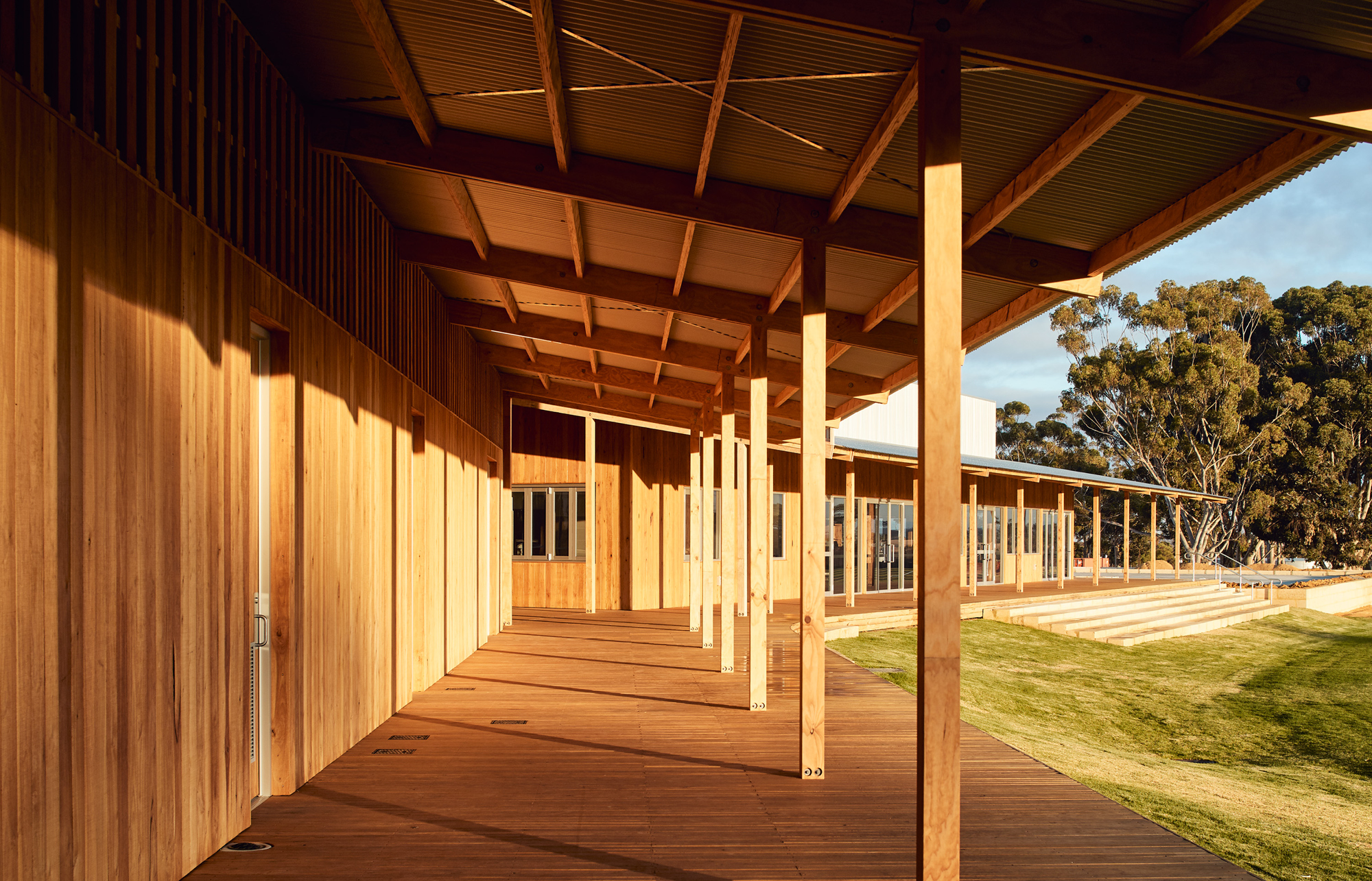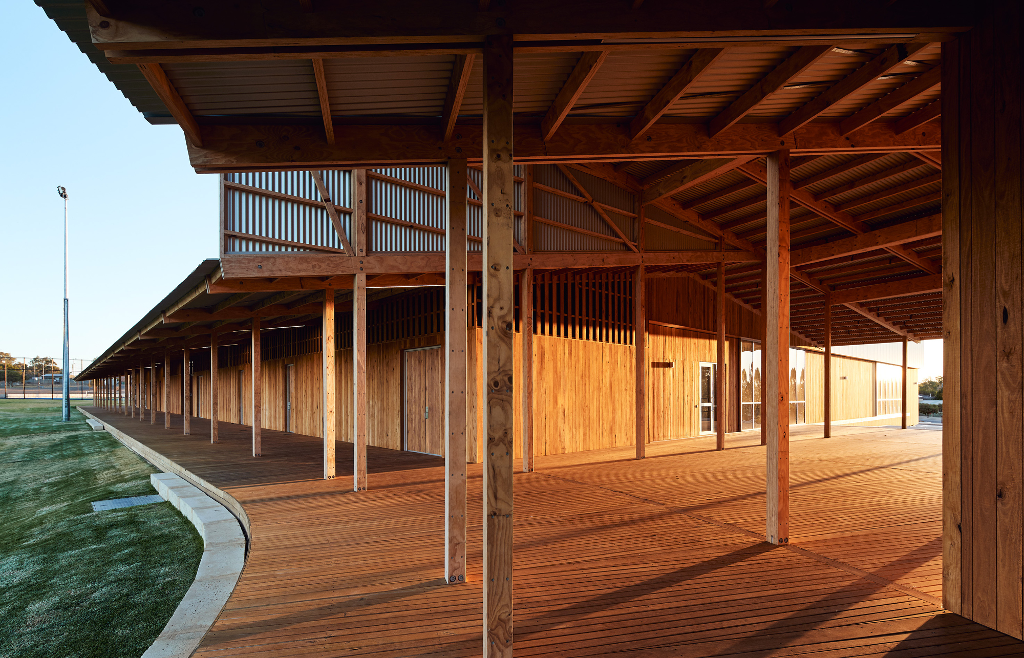 The facility consists of four pavilions linked by a long verandah. This provides an activity zone, shelter from the winds and the sun and acts as a viewing platform to watch field sports on the oval or lawn bowls to the north.