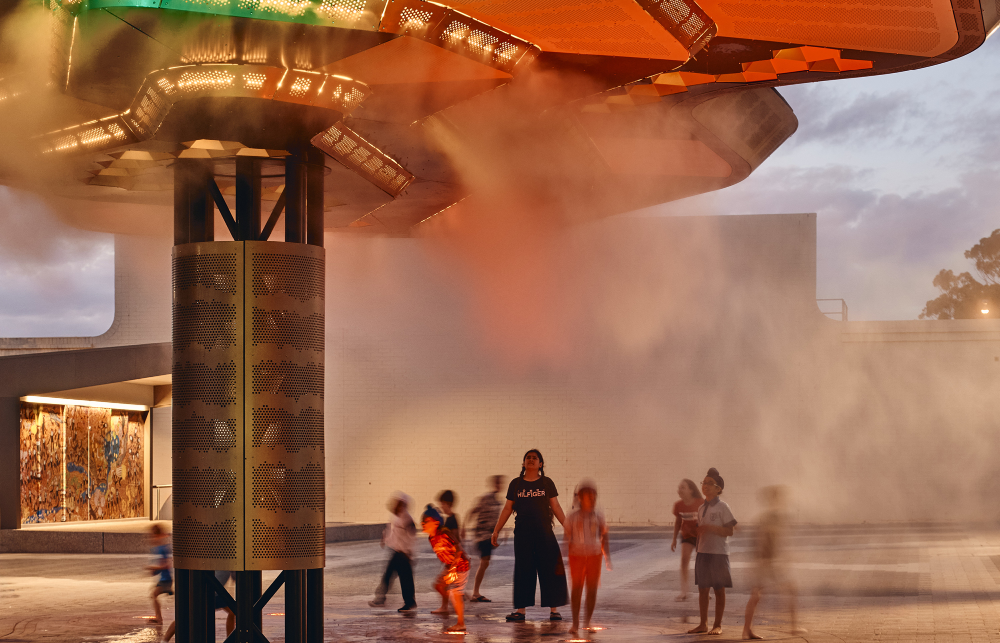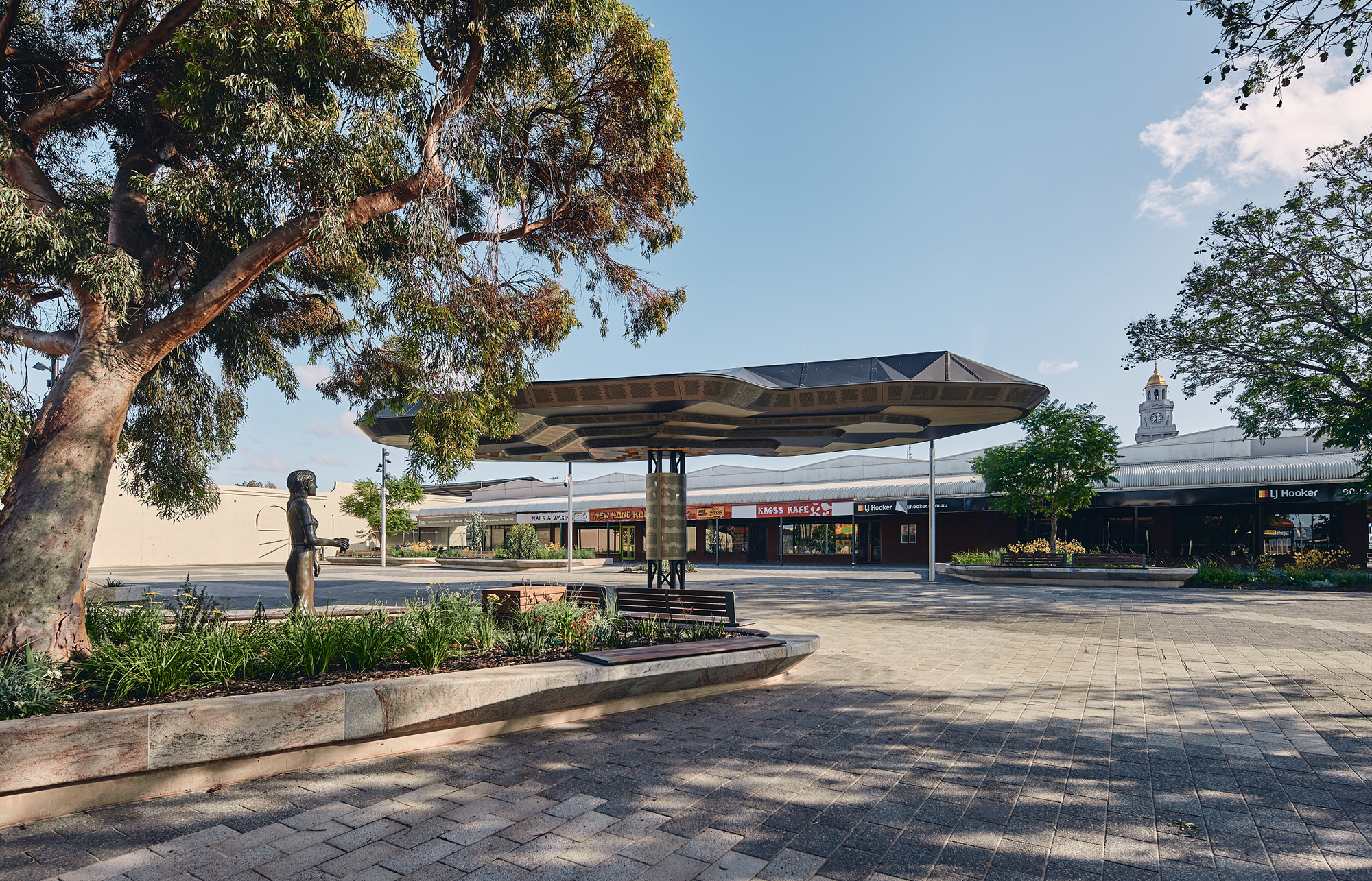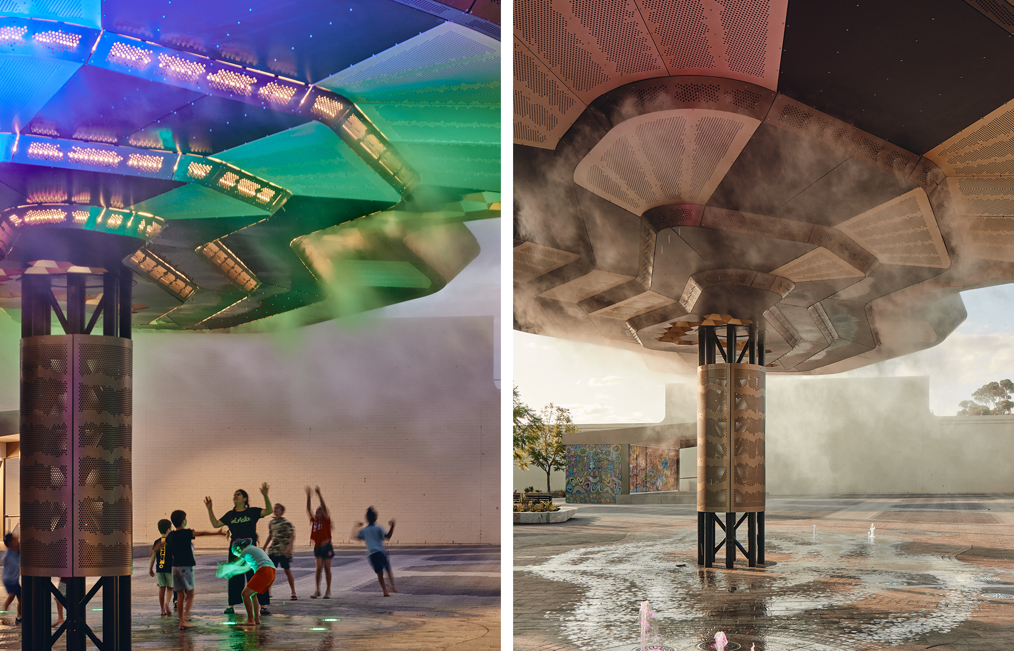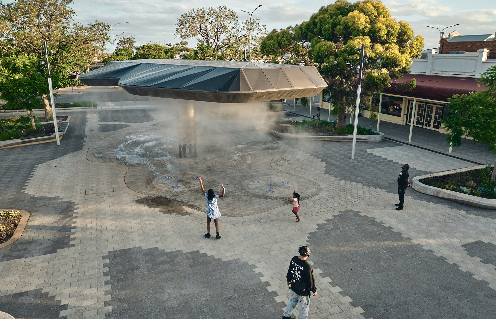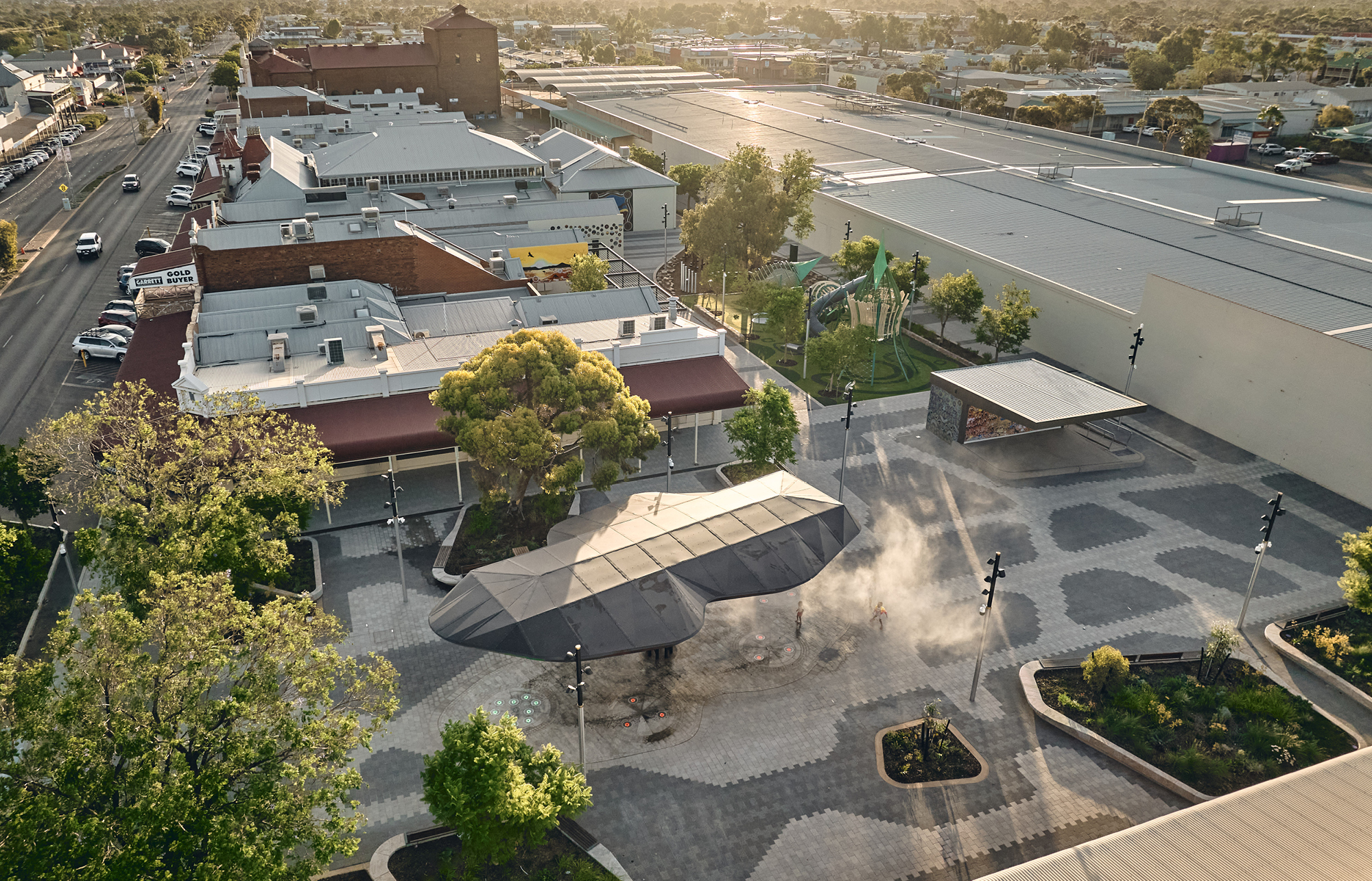 St Barbara Square Kalgoorlie transforms rear laneway service and adjacent space into a new ‘Kalgoorlie Heart’. ‘’Kurturtu is a highly activated public space, that pulses with the energy of the region and community, offering facilities and new experiences for all people. The new design carefully stitches together existing access points while weaving in new city connections. This is bound by a collection of site and city specific narratives that reveal the unique qualities of Kalgoorlie– Boulder. Conceptually, the square brings to the surface the ancient geological formations. The central canopy becomes a place of destination, water becomes a catalyst for play, meeting, and gathering. The central canopy titled; ‘Hovering Earth’ is the lifting of earth to reveal ‘what lies below’. A golden seam and perforated contours hover precariously above creating awe and delight; sound, misting and lighting activate and invite one to participate and become part of this spectacle.