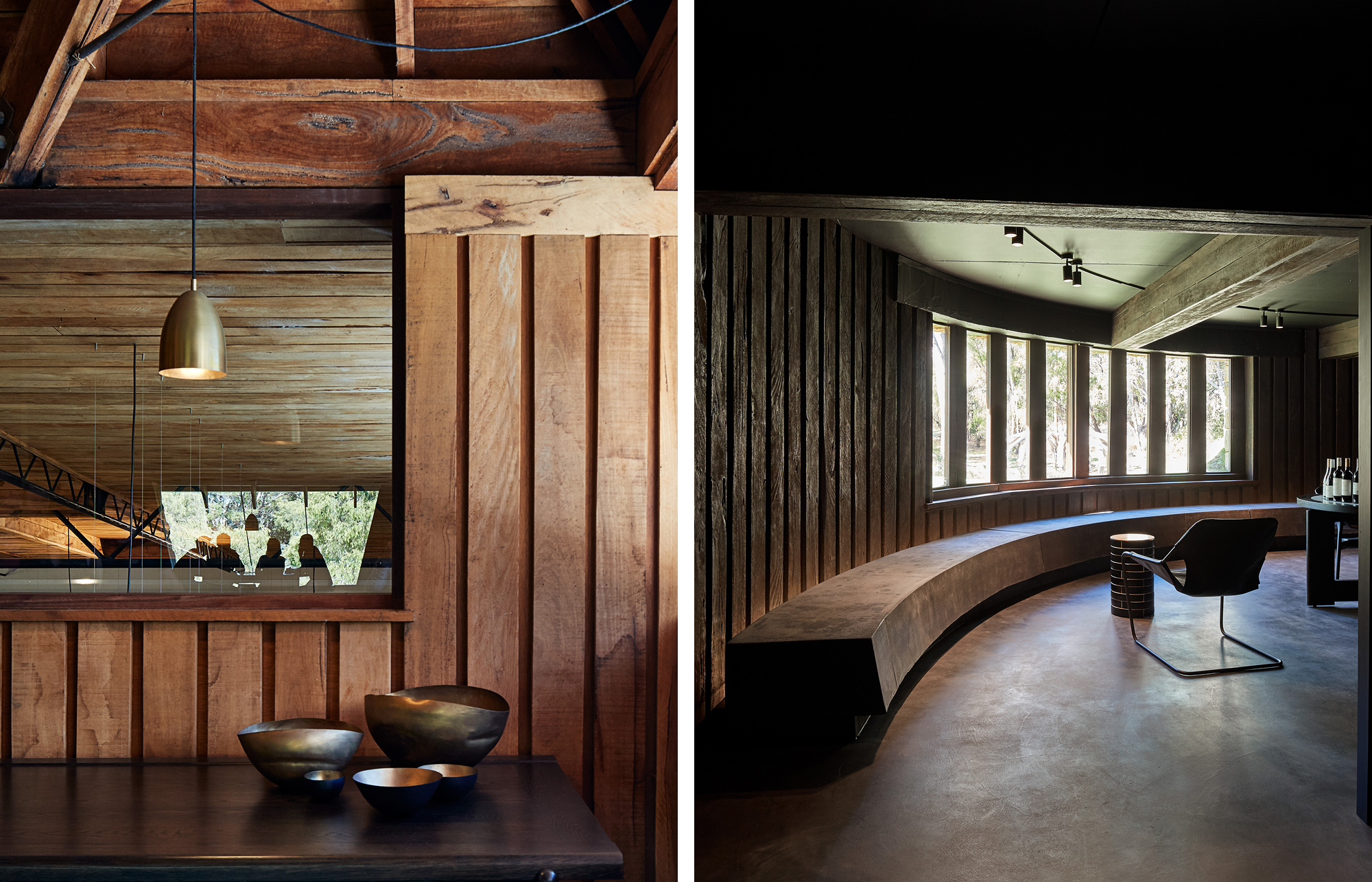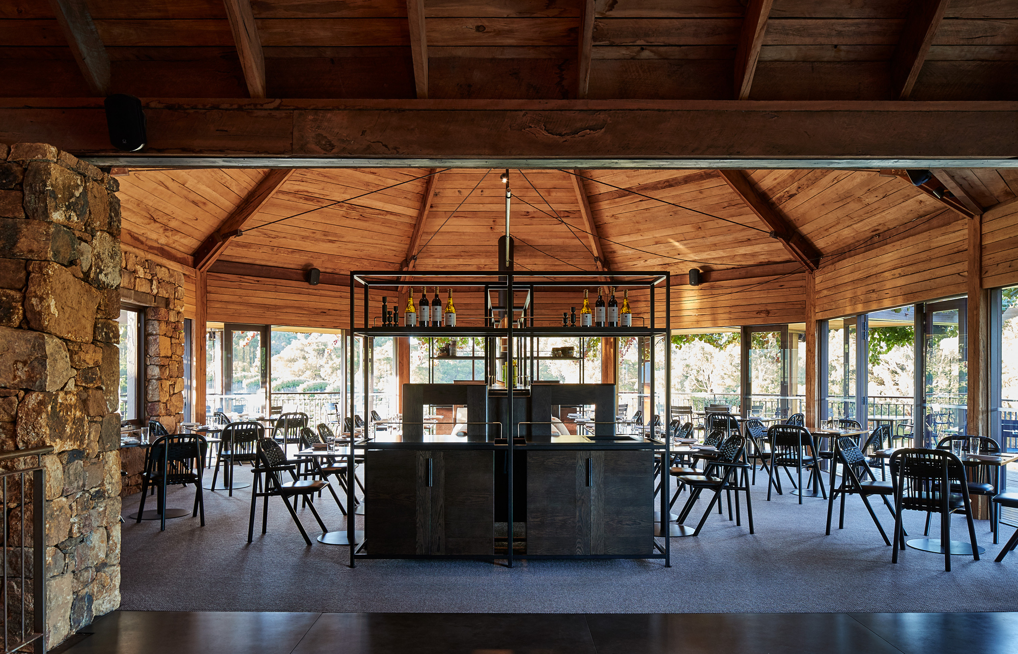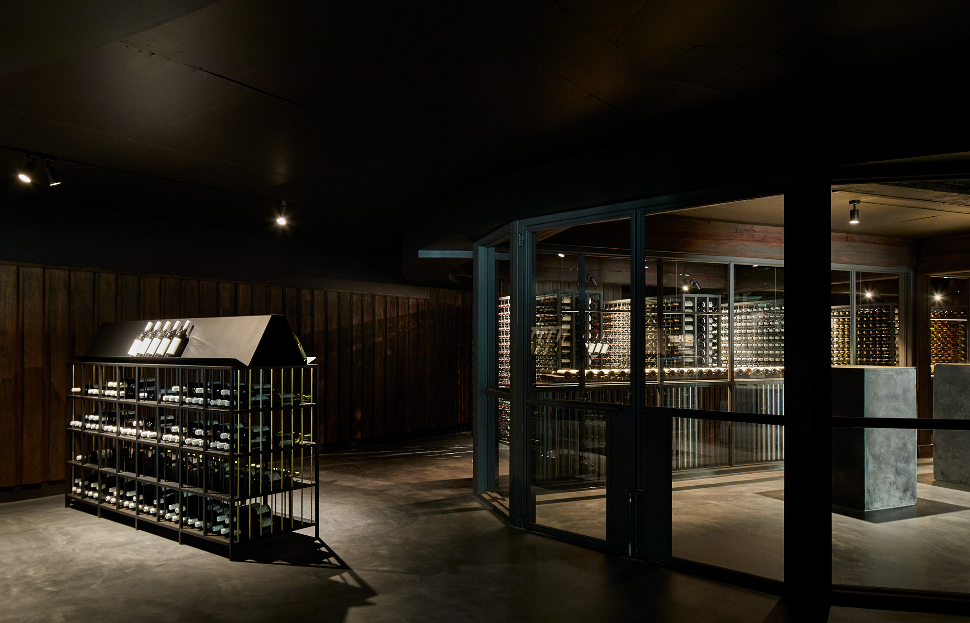 Over several years the layers of the building were peeled back, removing large sheds, shifting landscape, laying a new entry road, simplifying logistics and production processes, re-orienting entry to the facility, creating a new functional ‘back of house’, ensuring compliance with current standards and technology and of course minimising downtime for the operations of the business with the longest closure only 5 weeks one winter. With a clean ‘shell’ intact new insertions were made in the refined palette of local stone, rough sawn recycled Marri and black steel. It is difficult to see where the existing stops and the new begins with big moves that changed the occupation of the space, the circulation and connectivity between functions. The result is a visually and physically integrated wine emporium across three levels of reinvigorated facility.The creation of an graceful interior to the restaurant, a composed tasting room and cellar door that opens onto the landscape and an atmospheric dark ‘vault’ in the basement for a museum collection of Vasse Felix wine.