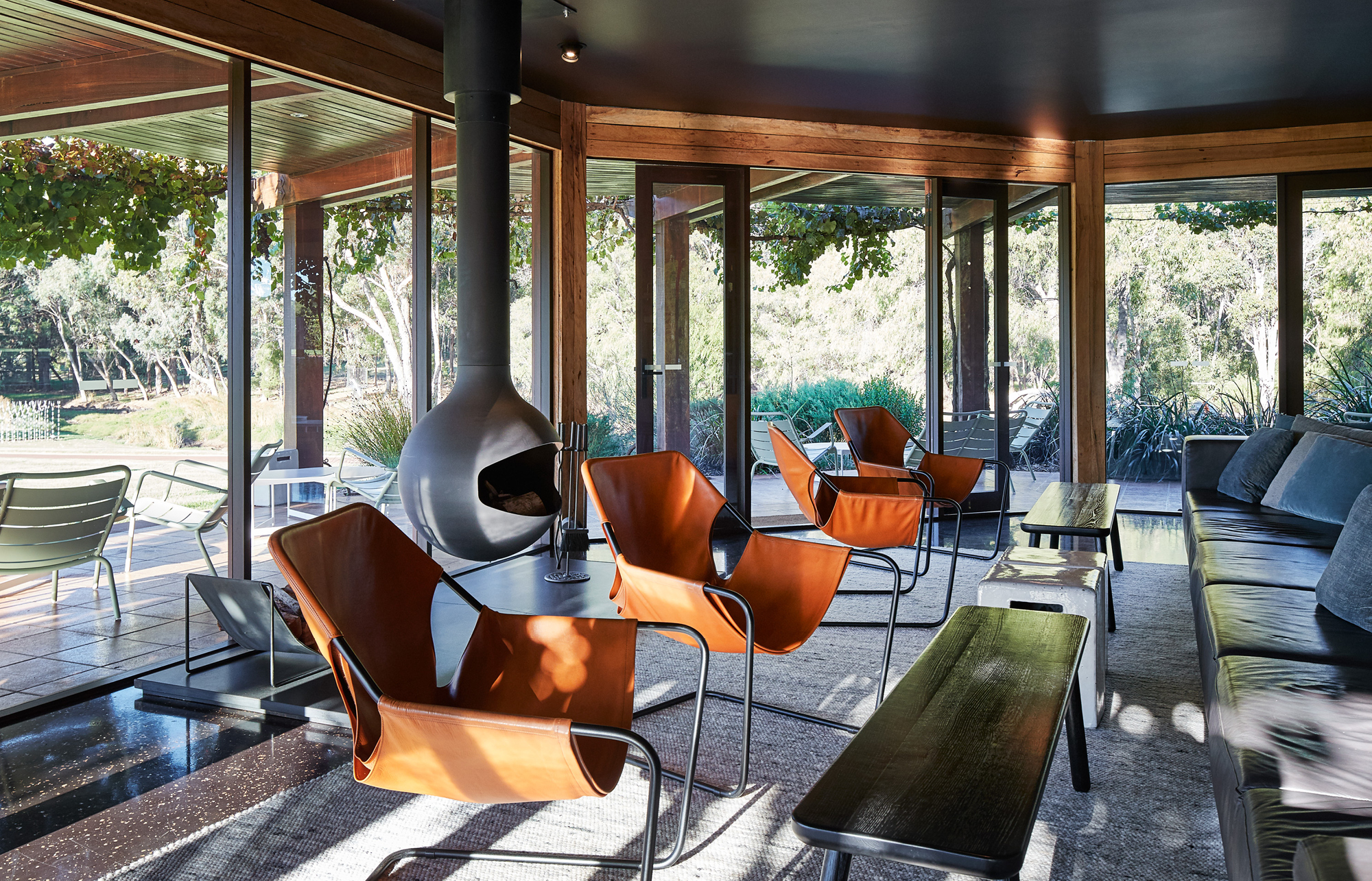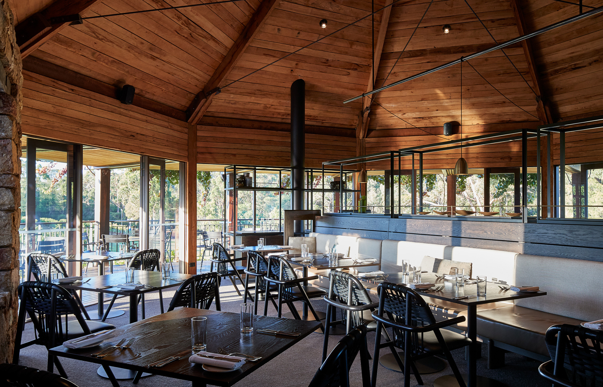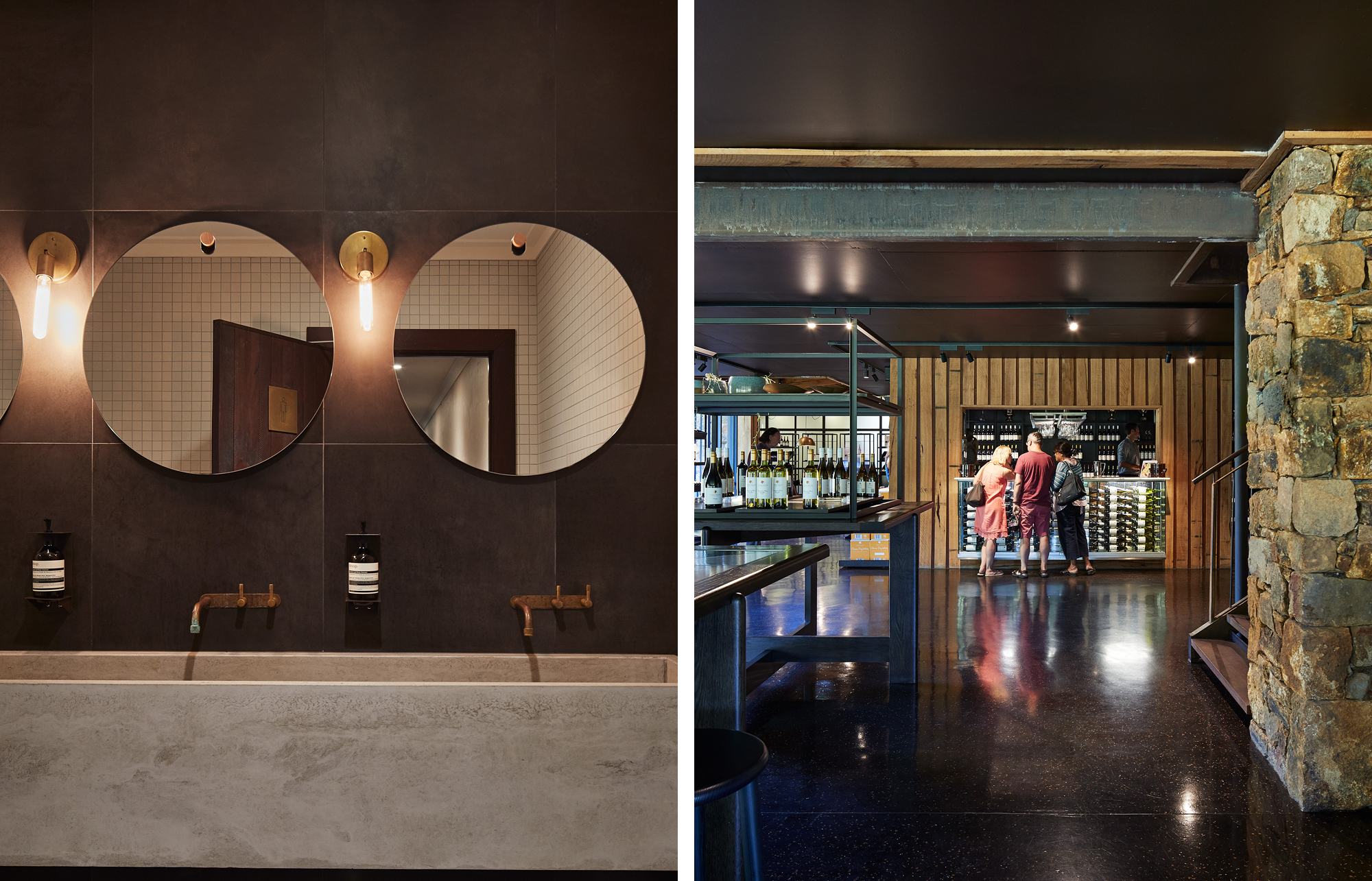 Over several years the layers of the building were peeled back, removing large sheds, shifting landscape, laying a new entry road, simplifying logistics and production processes, re-orienting entry to the facility, creating a new functional ‘back of house’, ensuring compliance with current standards and technology and of course minimising downtime for the operations of the business with the longest closure only 5 weeks one winter. With a clean ‘shell’ intact new insertions were made in the refined palette of local stone, rough sawn recycled Marri and black steel. It is difficult to see where the existing stops and the new begins with big moves that changed the occupation of the space, the circulation and connectivity between functions. The result is a visually and physically integrated wine emporium across three levels of reinvigorated facility.The creation of an graceful interior to the restaurant, a composed tasting room and cellar door that opens onto the landscape and an atmospheric dark ‘vault’ in the basement for a museum collection of Vasse Felix wine.